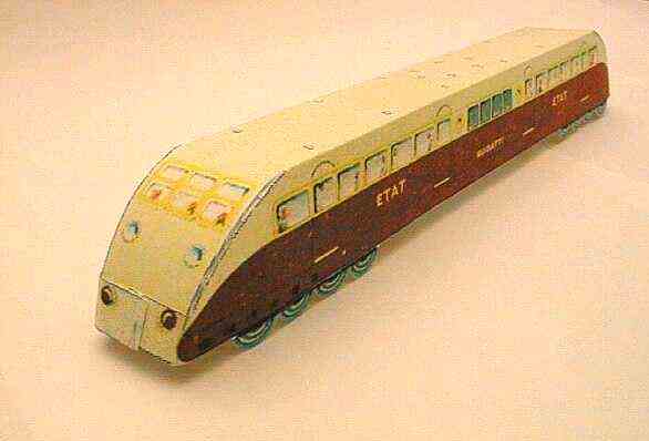 Un découpage Cartonia de 1935 restauré : à l'origine l'assemblage est fait par pattes mais le collage a été nécessaire. Il manque le cockpit du conducteur.